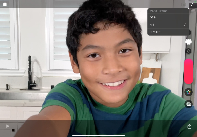 ビデオのアスペクト比を設定します。アスペクト比ボタンをタップし、「4:3」をタップします。