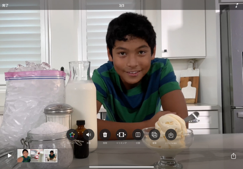 クリップをトリミングします。長さを変更したいクリップをタップして選択し、「トリミング」をタップします。開始マーカーや終了マーカーをドラッグして、クリップの開始位置と終了位置を設定してから、「トリミング」をタップします。