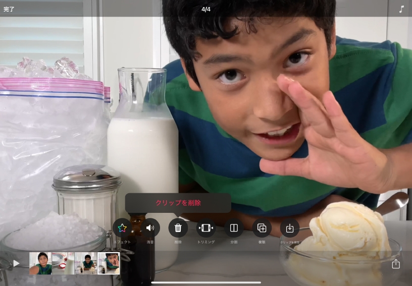 クリップを削除します。クリップをタップして選択し、「削除」をタップしたら、「クリップを削除」をタップして確定します。
