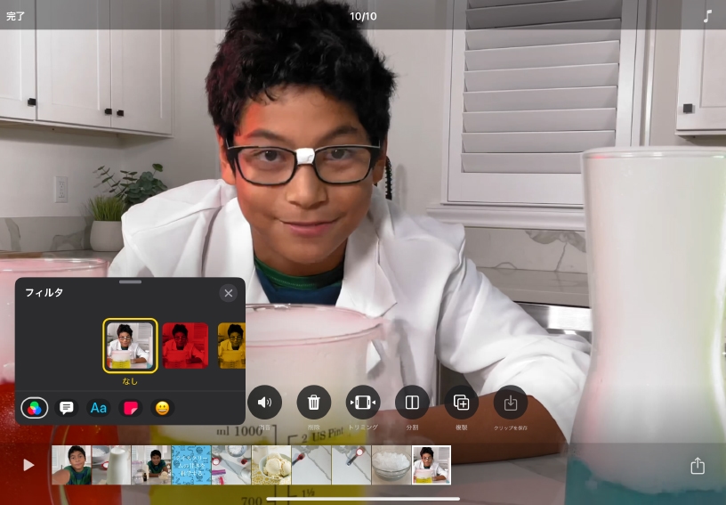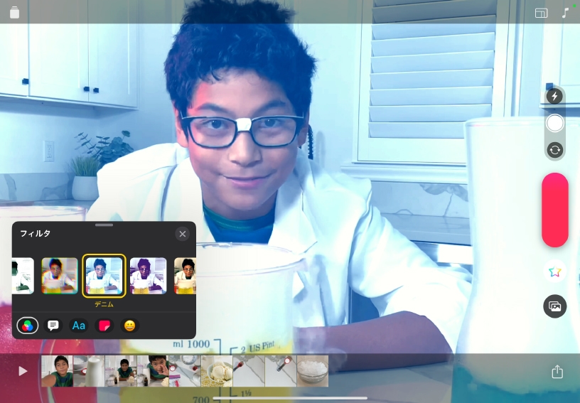 Clipsには楽しいエフェクトが用意されていて、ビデオに追加するのも簡単です。フィルタを使えばシーンの色調や見た目を演出できます。ステッカーや絵文字を追加すれば、映っているものを目立たせたり、考えや気持ち、アイデアを視覚的に伝えたりできます。