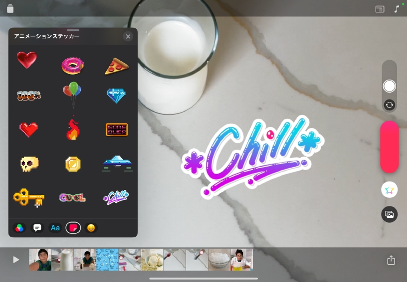 をタップします。スワイプして使いたいステッカーや絵文字を探し、見つけたらタップで選択します。ステッカーや絵文字をドラッグして位置を変えたり、2本指で回転させたり、ピンチ操作でサイズを調整したら、録画を開始します。