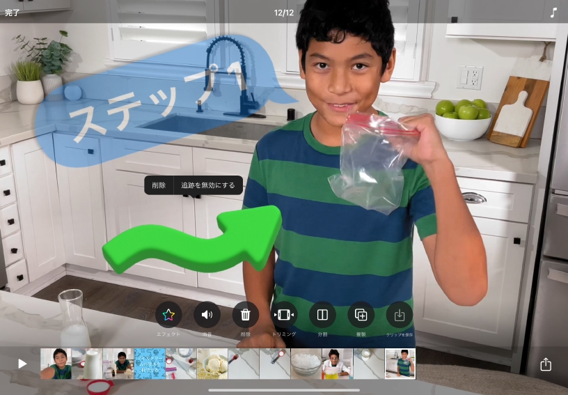 追跡を無効にしてみましょう。初期設定では、ビデオクリップに追加したステッカーや絵文字は、顔や類似する動くオブジェクトに合わせて移動します。ステッカーや絵文字を決まった位置から動かさないようにするには、そのステッカーや絵文字が追加されているクリップを選択し、目的のステッカーや絵文字をタップしてから「追跡を無効にする」を選択し、「完了」をタップします。