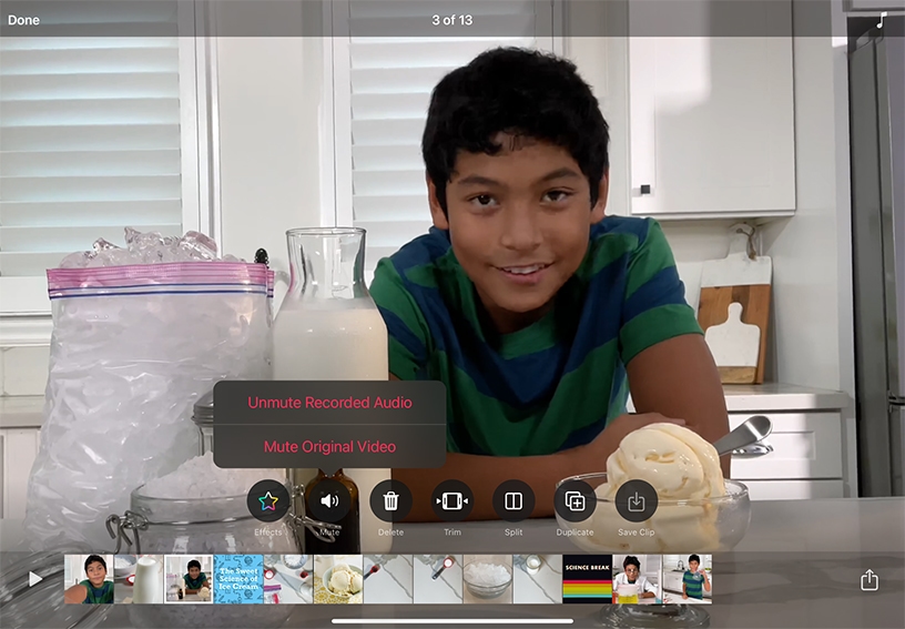 Mute a clip. Tap a clip you want to mute and tap Mute . If the clip has more than one kind of audio, you can choose which kind to mute.