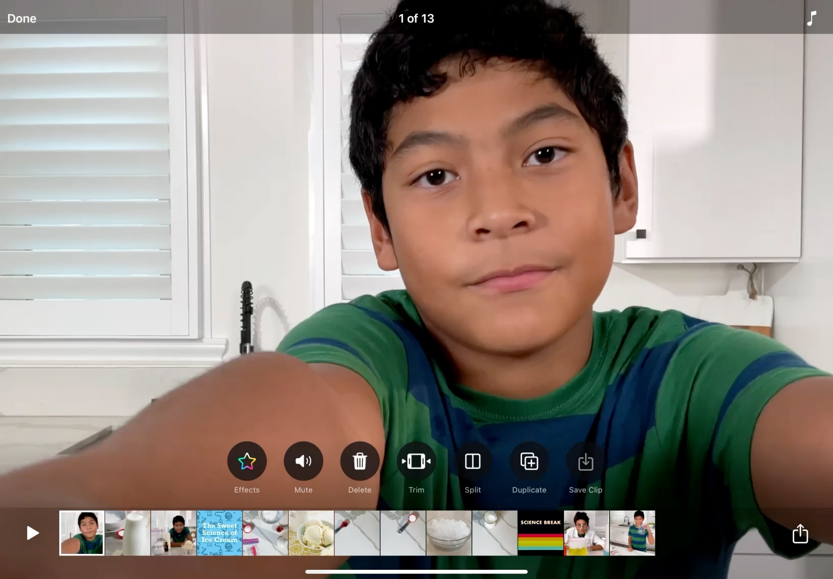 Make a video about a song, poem, or speech. Find an audio artifact that you have permission to use and add it to your library. Select it for your video in Clips, then add video clips and photos that provide context to the audio. Use text labels and stickers to show words and sounds in the audio.