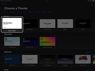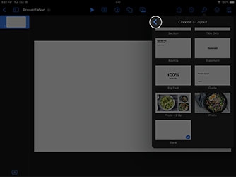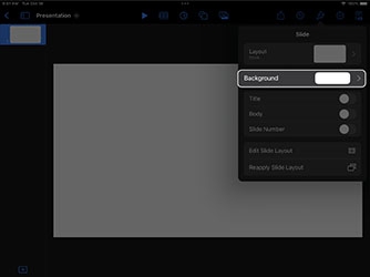 Crearás un documento de Keynote para usarlo como lienzo en blanco para tu diseño. Luego, cambiarás el color de fondo de la diapositiva para establecer la escena.