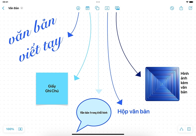 Bạn có thể di chuyển, xoay hoặc thay đổi kích thước các mục trên bảng Freeform. Chạm để chọn mục bạn muốn định vị, sau đó kéo từ chính giữa mục đó để thay đổi vị trí. Để định cỡ, kéo chấm màu xanh dương.