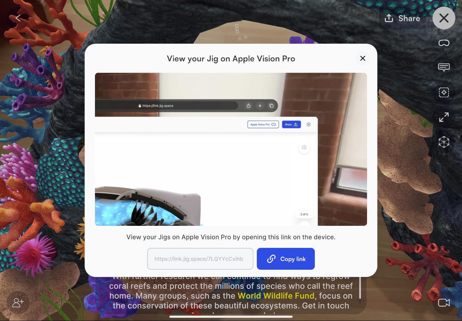Ga verder. Je kunt je koraalrif verkennen met de Apple Vision Pro. Ook de content die je in JigSpace hebt gemaakt kun je met de Apple Vision Pro bekijken.