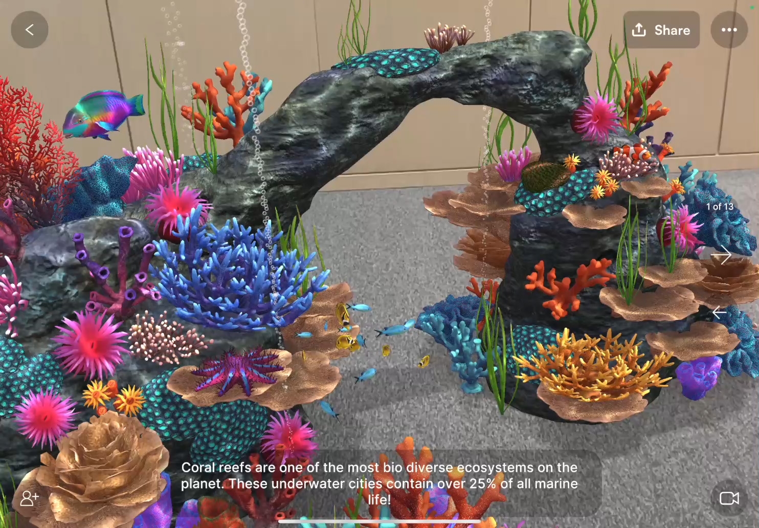 Bezoek het koraalrif. Tik door de introductievensters. Tik op het tabblad ‘Explore’ op ‘Coral Reef’ en ik daarna op ‘View in AR’. Volg de instructies op het scherm om het rif te plaatsen in het midden van een open ruimte.
